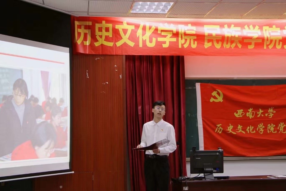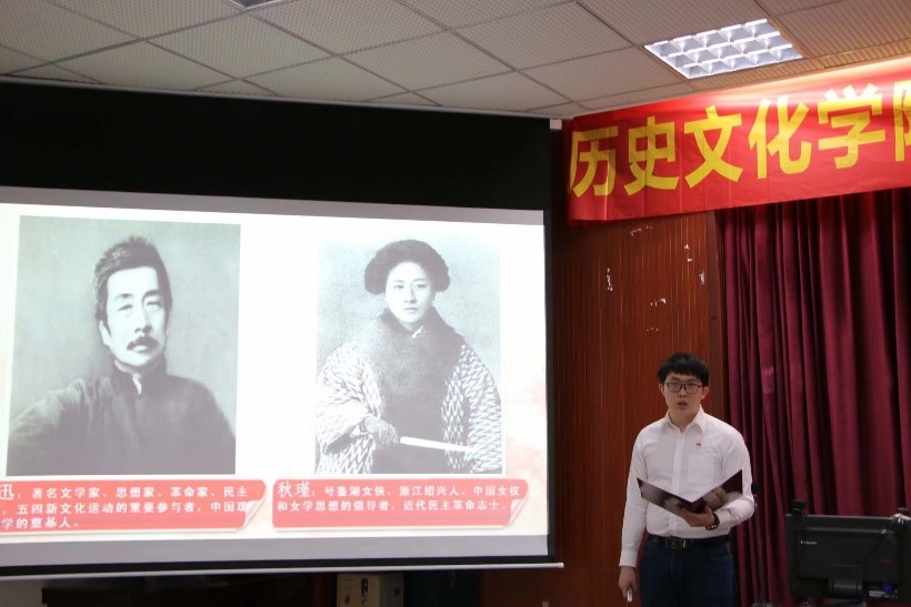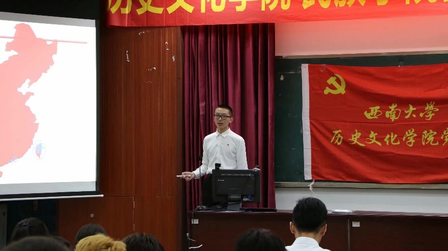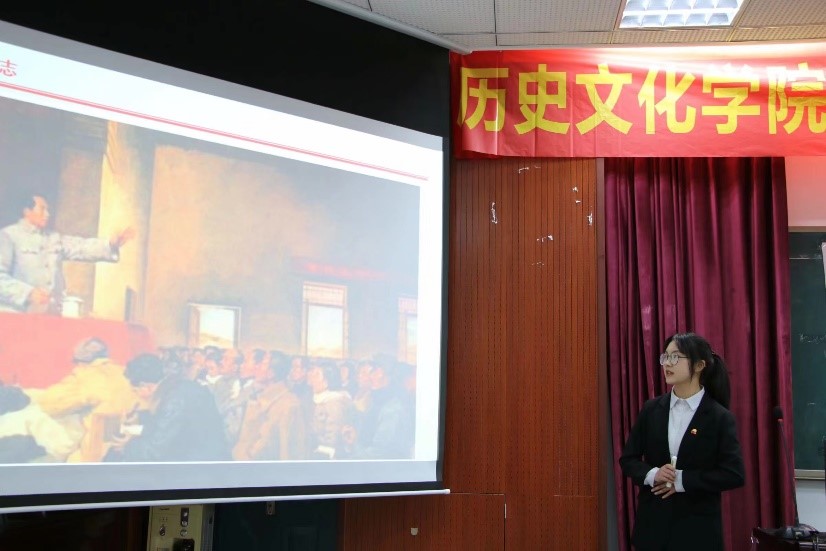 随后,本科2020级管丹同学带领大家回顾了1921年至1949年“浴血中华,开天辟地”的建党、建军、建国伟业。管丹同学娓娓讲述建党后中国共产党面临的重重困难与斗争勇气,并且分享相关图片,让同学们真切感受到长征二万五千里过草地、爬雪山的艰辛苦难,让同学们深刻体会到中国共产党在抗日战争、解放战争两大战役中的英勇功绩。