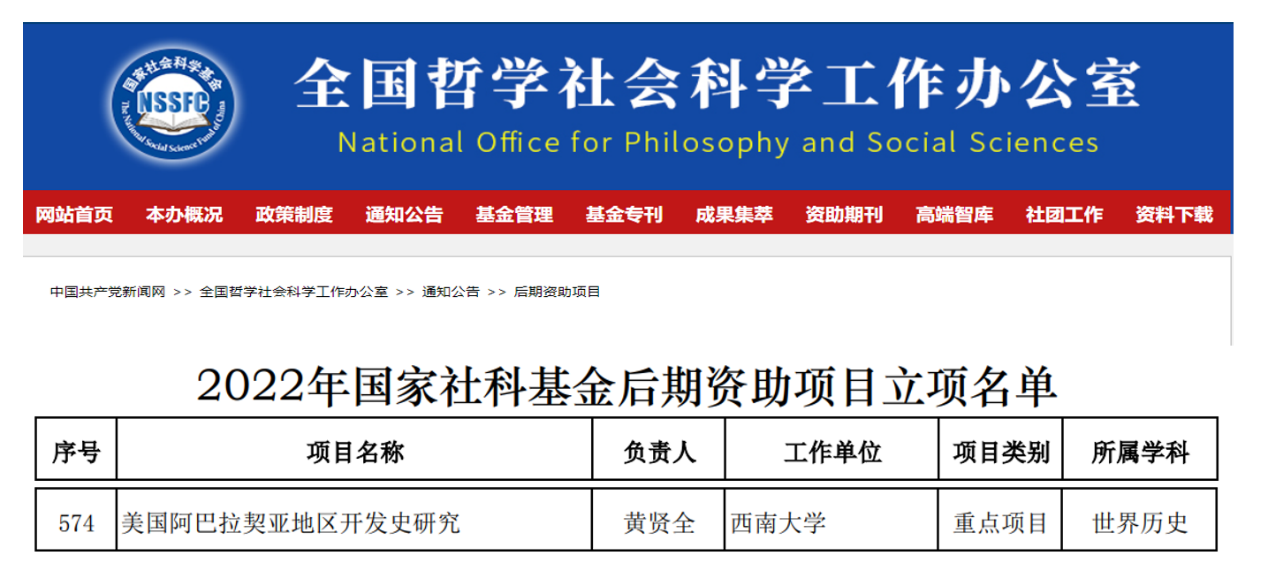 2022年11月29日,全国哲学社会科学工作办公室正式公布了2022年度国家社科基金后期资助项目立项名单。BB贝博艾弗森黄贤全教授的《美国阿巴拉契亚地区开发史研究》获批重点项目。