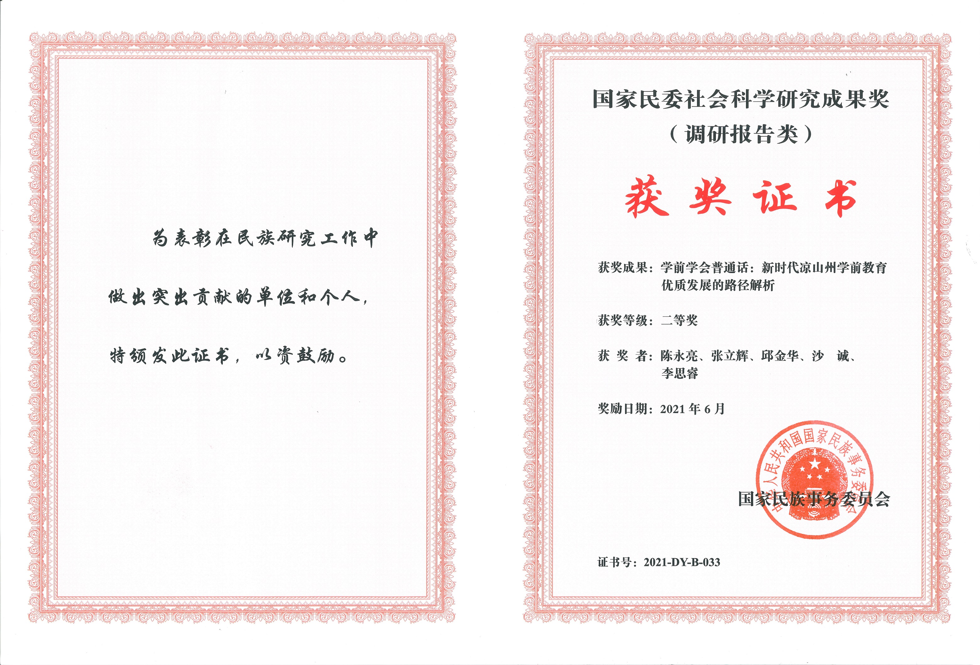 近日,2020年度国家民委社会科学优秀成果评选结果揭晓,公司教师陈永亮等撰写完成的《学前学会普通话:新时代凉山州学前教育优质发展的路径解析》,荣获国家民委社会科学研究成果奖(调研报告类)二等奖,展示出公司在民族研究领域的优势。