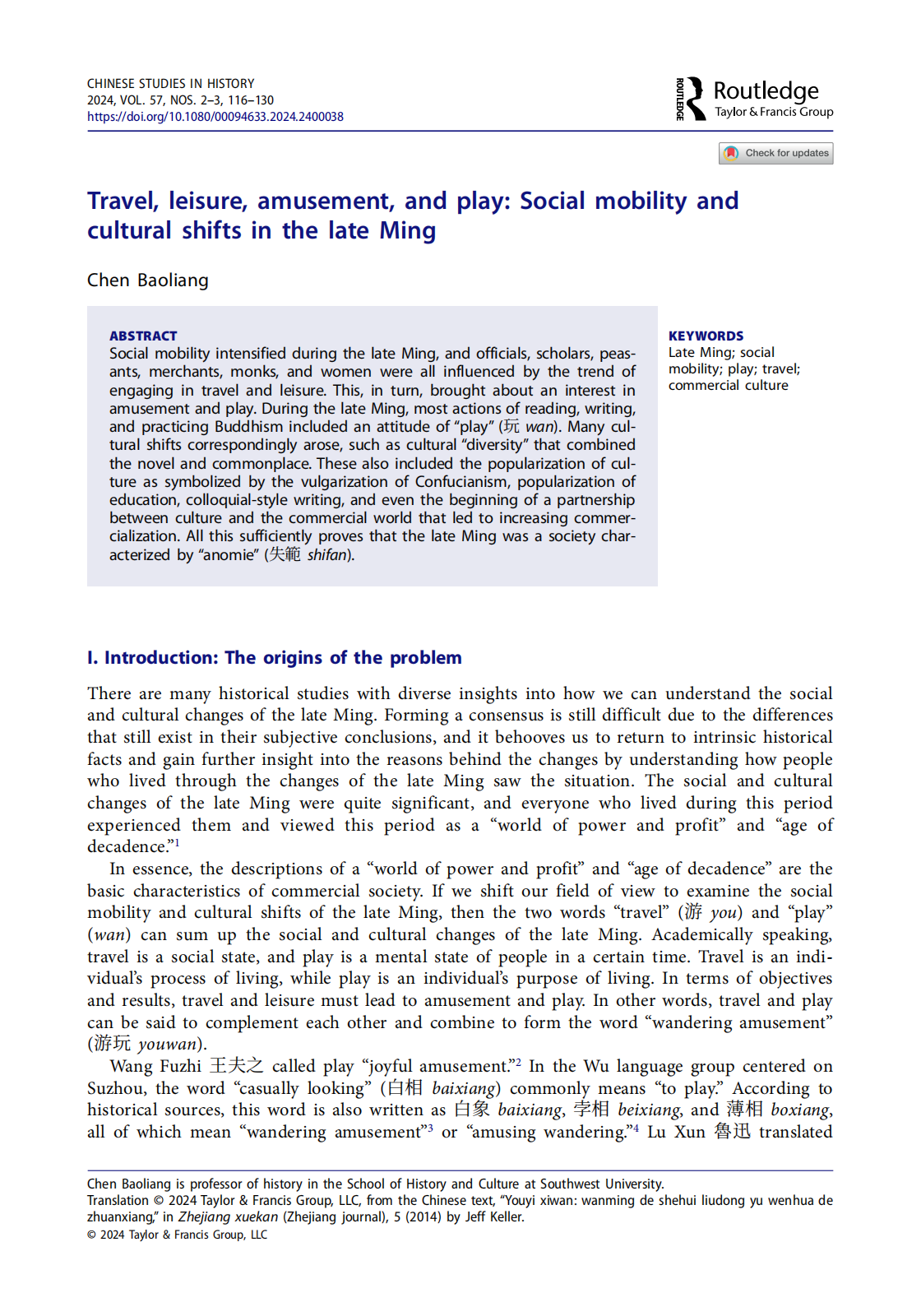 近日,国际著名期刊CHINESE STUDIES IN HISTORY(《中国历史研究》)第57卷第2-3期(2024年)发表了BB贝博艾弗森 民族公司陈宝良教授的学术论文《游逸嬉玩:晚明的社会流动与文化的转向》(Travel,leisure, amusement, and play: Social mobility and cultural shifts in the late Ming)。文章认为:明代后期,社会流动性增强,官员、士人、农民、工商、僧人、妇女都受到游逸风气的影响。游逸的结果则导致嬉玩成风。在晚明,大多数的读书、著书和佛教修行活动都包含了一种“游戏”(玩)的态度。随之而来的是许多文化转向,如新奇与庸常并行的文化“多样性”,以儒学的庸俗化、教育的平民化与文章的口语化为表征的文化通俗化,以及文化开始与商业世界结合并日趋商业化。这一切充分证明,晚明是一个以“失范”为特征的社会。