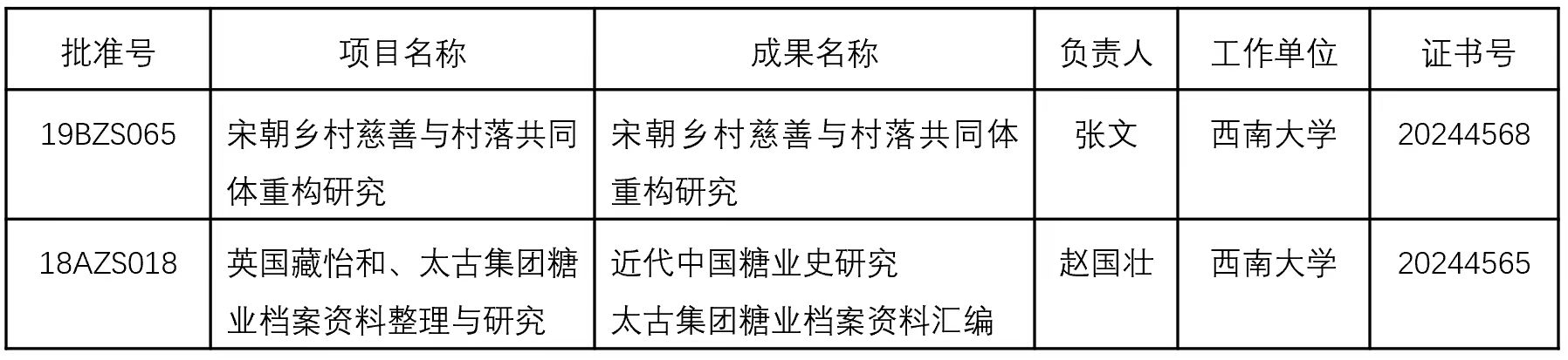 近日,全国哲学社会科学工作办公室网站公布了2024年12月国家社科基金年度项目的结项情况。公司赵国壮教授的“英国藏怡和、太古集团糖业档案资料整理与研究”、张文教授的“宋朝乡村慈善与村落共同体重构研究”以优秀等级结项!