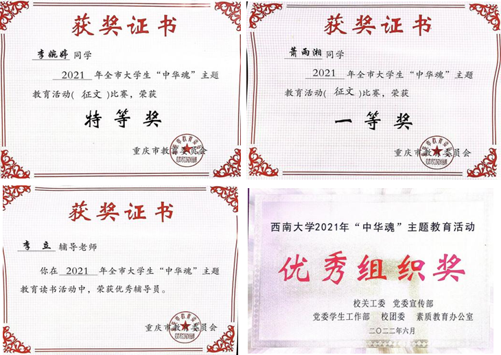 近日,根据重庆市关工委和公司关工委通报,在2021年全市高等公司老员工“中华魂”主题教育读书活动征文演讲比赛中,公司李婉婷和萧雨湘2名员工的征文作品分获重庆市特等奖和一等奖,指导教师李立被评为重庆市优秀辅导员,公司连续三年获评公司优秀组织奖。
