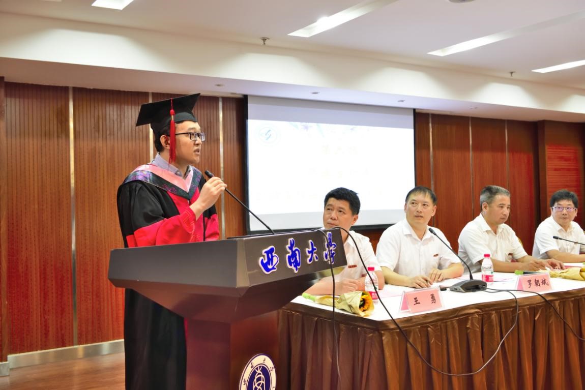 毕业生代表、博士研究生李杰同学结合自己在公司硕博六年的求学经历,表达了对公司、老师和同学们的感激。他分享了自己对如何处理好个人欲求和内心修为之间的矛盾、平衡好现实追求与价值操守之间的冲突等重要问题的思考,代表全体毕业生提出了坚守底线,常怀敬畏之心和仁厚之情的自我要求。
