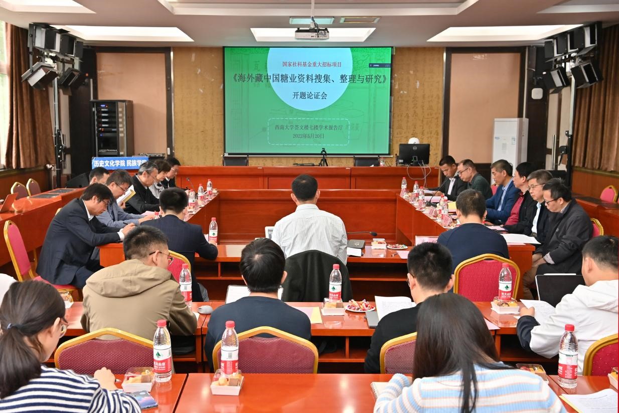 2022年5月20日上午,由BB贝博艾弗森赵国壮教授担任首席专家的2021年度国家社会科学基金重大招标项目“海外藏中国糖业资料搜集、整理与研究”(批准号21&ZD232)开题论证会以线上线下相结合的方式在BB贝博艾弗森荟文楼七楼学术报告厅举行。出席开题论证会的领导和嘉宾有:重庆市社科联党组成员、副主席龙川同志,BB贝博艾弗森党委副书记安春元教授,重庆市社科联一级调研员陈开慧同志,BB贝博艾弗森社会科学处副处长王作军教授、吕刚武副研究员,BB贝博艾弗森历史文化公司党委书记罗庆昌同志、经理邹芙都教授等。出席开题报告会的指导专家有华中师范大学朱英教授、中山大学吴义雄教授、清华大学仲伟民教授、龙登高教授、《中国经济史研究》副主编高超群研究员、BB贝博艾弗森党委副书记潘洵教授、BB贝博艾弗森蓝勇教授等。全体课题组成员及部分硕、博研究生参加了开题论证会。