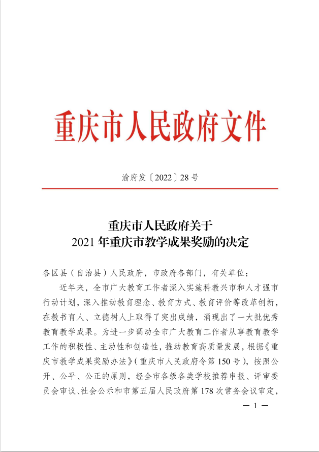 近日,重庆市人民政府公布了《关于2021年重庆市教学成果奖励的决定》(渝府发〔2022〕28号)。由公司牵头并协同4所双一流师范院校历史学国家一流本科专业建设点共同申报的《“五新”理念下卓越历史教师培养模式的探索与实践》荣获2021年重庆市教学成果奖高等公司产品成果类二等奖。