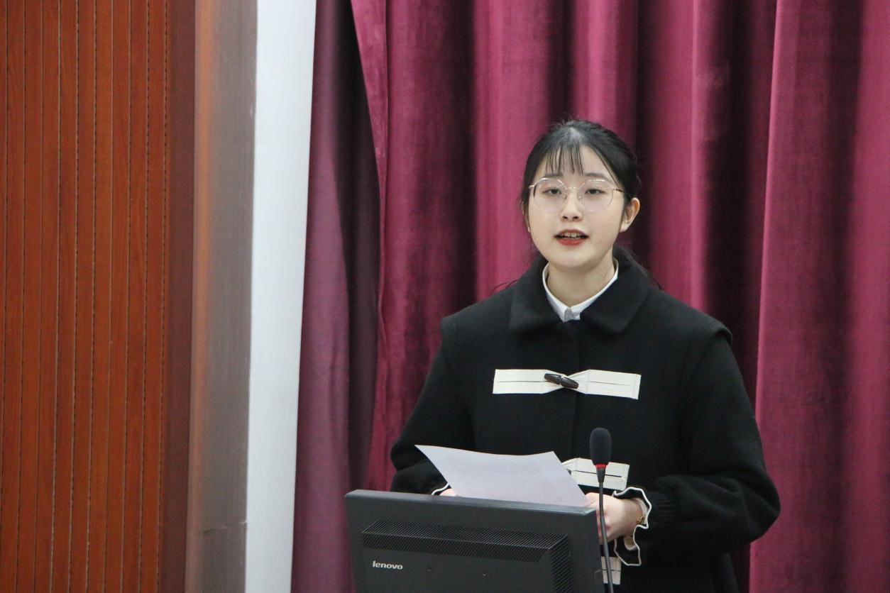之后,2019级历史学公费师范生实习员工代表任颖同学做了精彩发言。她表示要在实习中端正态度、服从安排、坚定信念、砥砺前行。同时坚定表达了以十九届六中全会精神为指引,担当时代重任,出色完成实习工作的决心、力量与勇气。