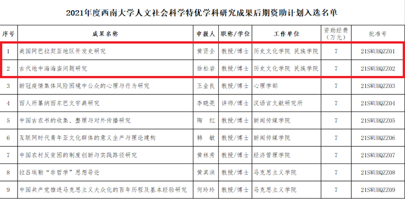 近日,社会科学处公布了《2021年度BB贝博艾弗森人文社会科学特优学科研究成果后期资助计划入选名单》,公司黄贤全教授的《美国阿巴拉契亚地区开发史研究》与徐松岩教授的《古代地中海海盗问题研究》成功入选。