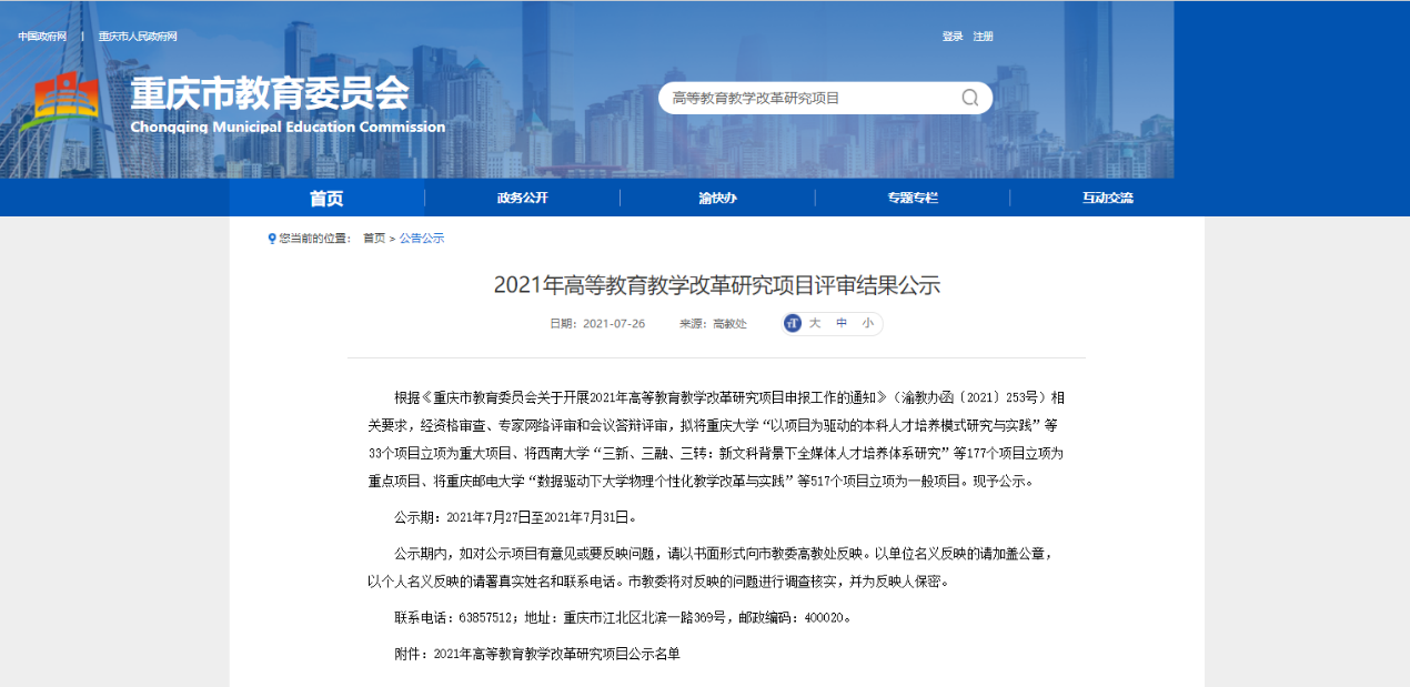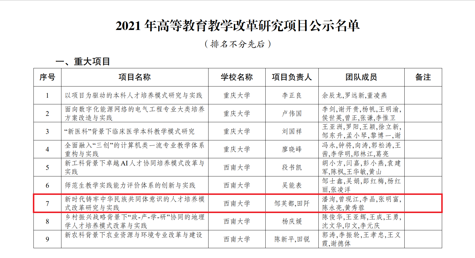 日前,重庆市教育委员会公布重庆市高等公司产品改革研究项目立项名单,公司邹芙都、田阡教授领衔申报的重大项目《新时代铸牢中华民族共同体意识的人才培养模式改革研究与实践》成功获得立项,项目团队成员为公司教师潘洵、曾现江、李晶、张明富、陈永亮、黄秀蓉等。此次全市高校共有33项获重大项目立项,其中BB贝博艾弗森获5项居于首位。