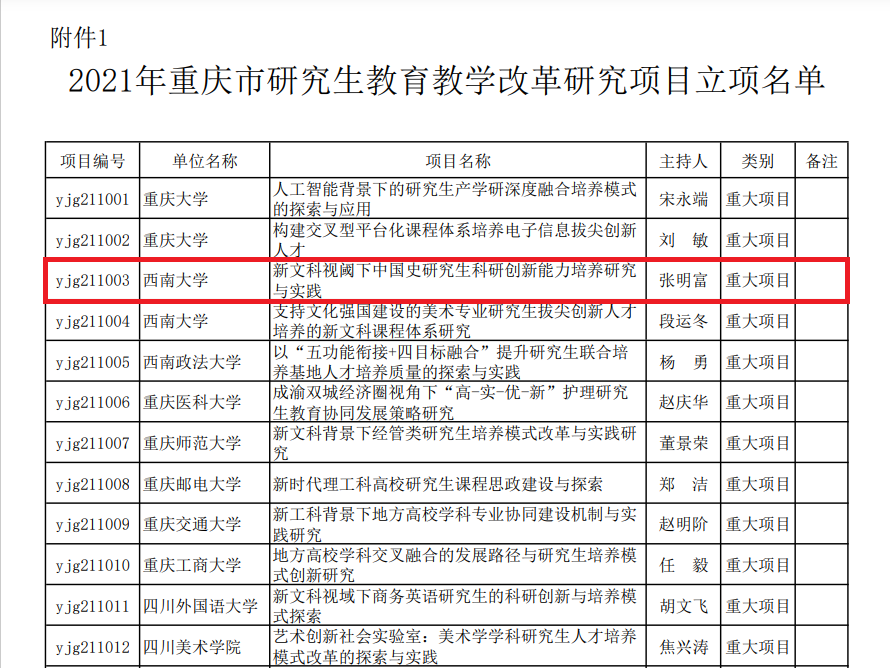 近日,重庆市教育委员会下发了《关于同意2021年研究生公司产品改革研究项目立项的通知》,公司张明富教授主持申报的重大项目《新文科视阈下中国史研究生科研创新能力培养研究与实践》成功获得立项。本次立项工作,重庆市各高校共有26项重大项目获得立项(其中定向、委托项目9项),BB贝博艾弗森共获重大项目6项(其中定向、委托项目4项)。
