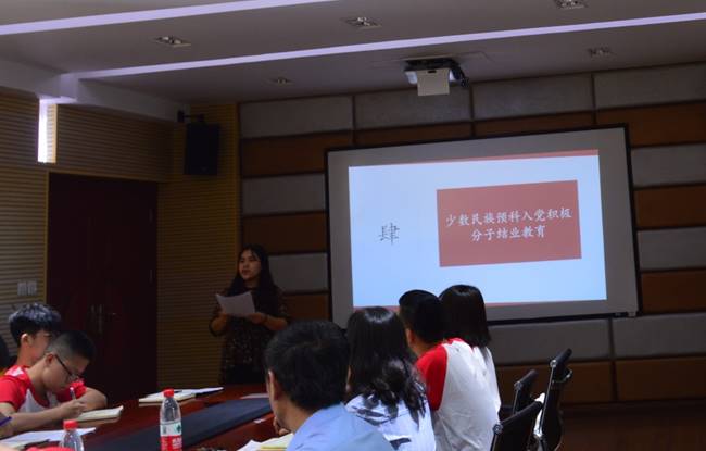 接下来,支部为少数民族预科入党积极分子进行了结业教育。员工代表阿斯古丽用情感真挚的发言、十余位预科积极分子用庄严神圣的学子宣言从不同侧面表达了自己作为中国人、西大人、预科人维护民族团结、服务民族振兴的初心和决心。