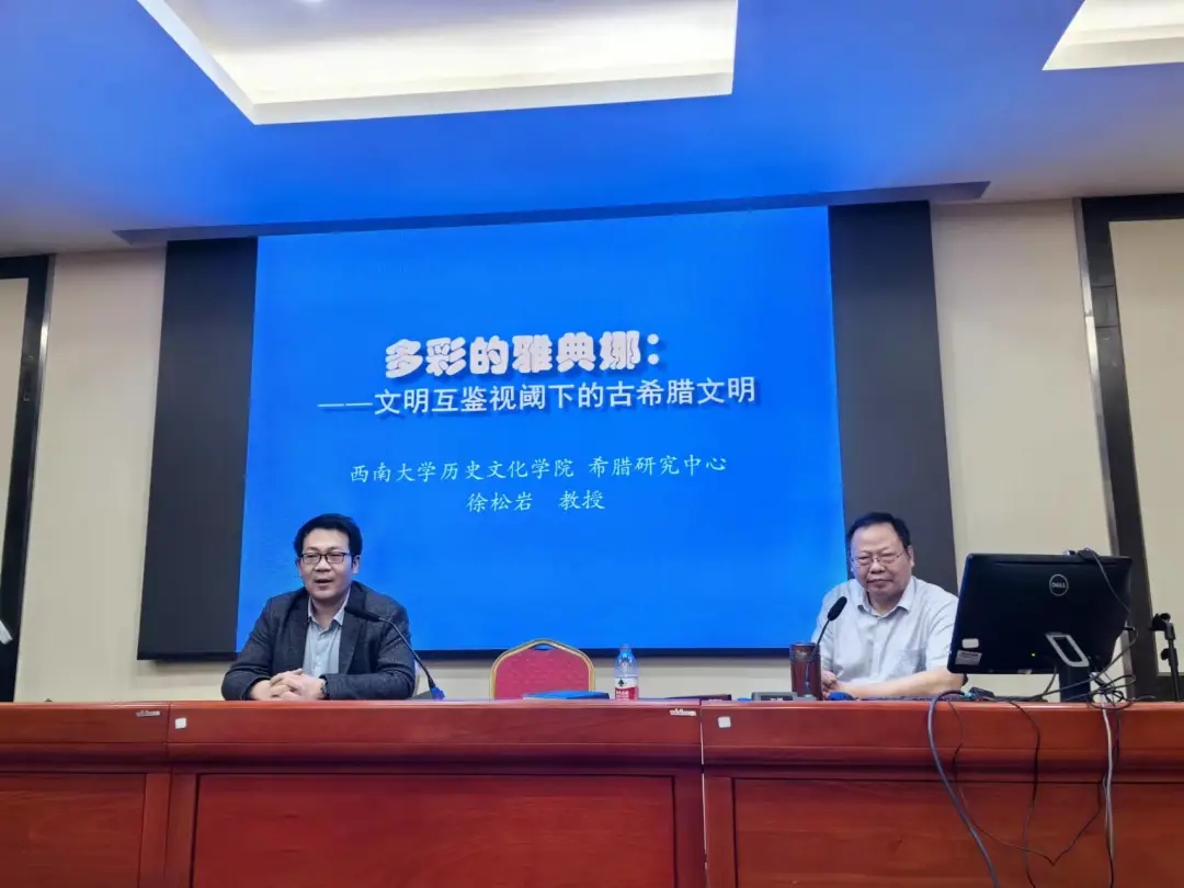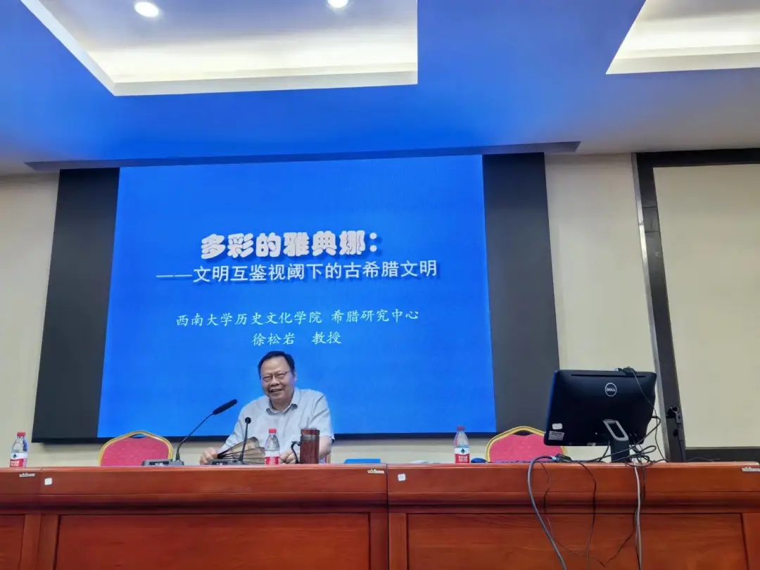 2024年4月12日,2023级历史学拔尖创新实验班系列学术讲座继续开讲。本次讲座邀请到BB贝博艾弗森教授、教育部国别区域研究基地希腊研究中心主任、古典文明研究所所长、博士生导师徐松岩教授以“多彩的雅典娜—文明互鉴视阈下的古希腊文明”为题,为公司大一本科历史学、民族学班同学们带来了一场精彩的学术讲座。讲座由公司副经理李晶主持,公司党委副书记张静、部分青年教师以及历史学、民族学拔尖创新实验班全体同学参加讲座。