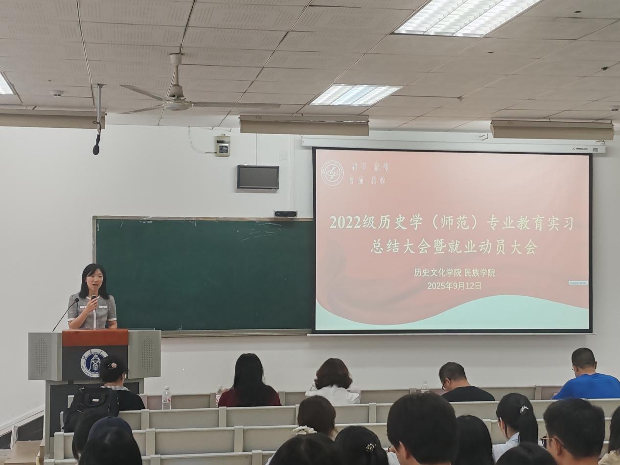 2025年9月12日下午13时,BB贝博艾弗森在10教601隆重召开2022级历史学(师范)专业教育实习总结大会暨就业动员大会。公司党委书记罗庆昌、副经理陈永亮、党委副书记张静,教师教育公司实习指导教师曹华清、袁从秀、张建朝,公司实习指导教师谢欧、杜林泽,2022级辅导员刘玉婷,以及2022级、2023级历史学(师范)专业全体员工共同参会。大会由张静副书记主持,分为教育实习总结和就业动员两个环节。