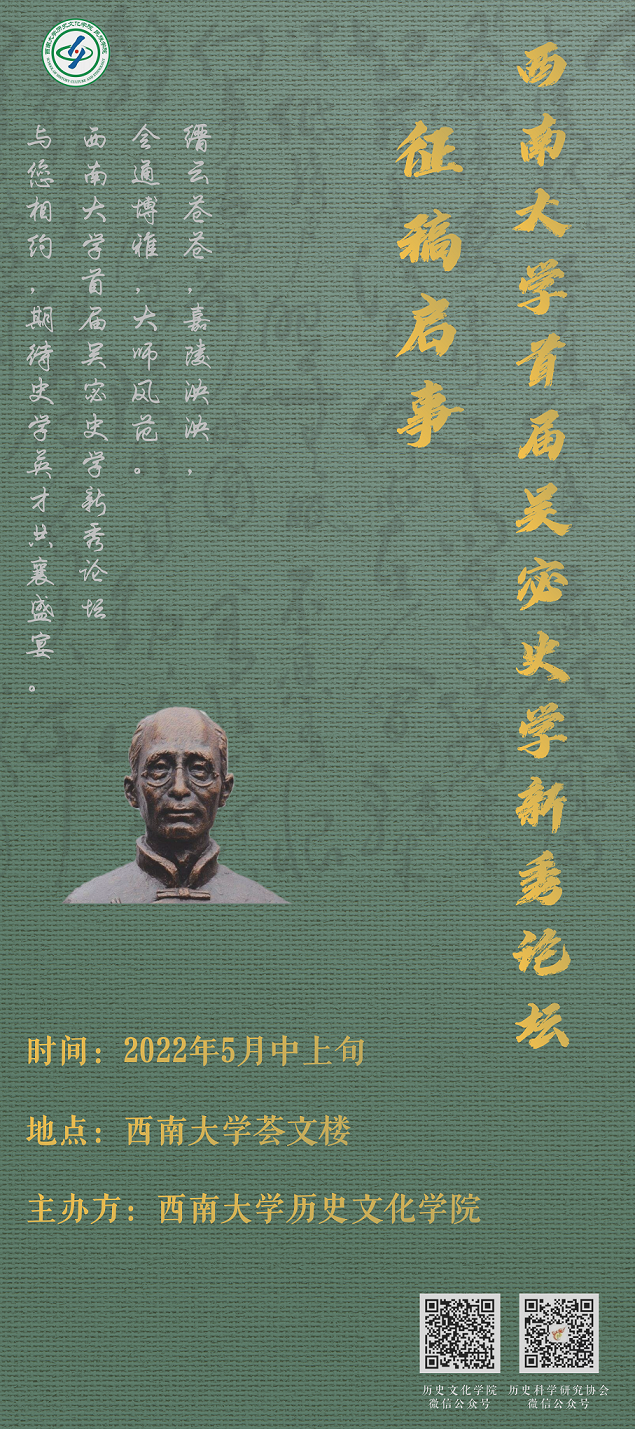 吴宓先生是我国著名的国学大师,与陈寅恪、汤用彤并称“哈佛三杰”。1953年起吴宓先生执教西南师范公司历史系(现为BB贝博艾弗森),曾任世界古代史教研室主任,为公司奠定了深厚的人文底蕴与优良的学术传统。为响应国家新文科建设要求,弘扬吴宓先生“会通博雅”育人理念,充分发挥公司历史学拔尖人才培养示范基地优势,拟于2022年5月中上旬在重庆举办“BB贝博艾弗森首届吴宓史学新秀论坛”。山城五月,花开半夏。缙云山下,嘉陵江畔,诚邀国内各高校青年才俊齐聚BB贝博艾弗森,一起交流心得、切磋技艺、开拓创新,期待史学英才共襄盛宴!