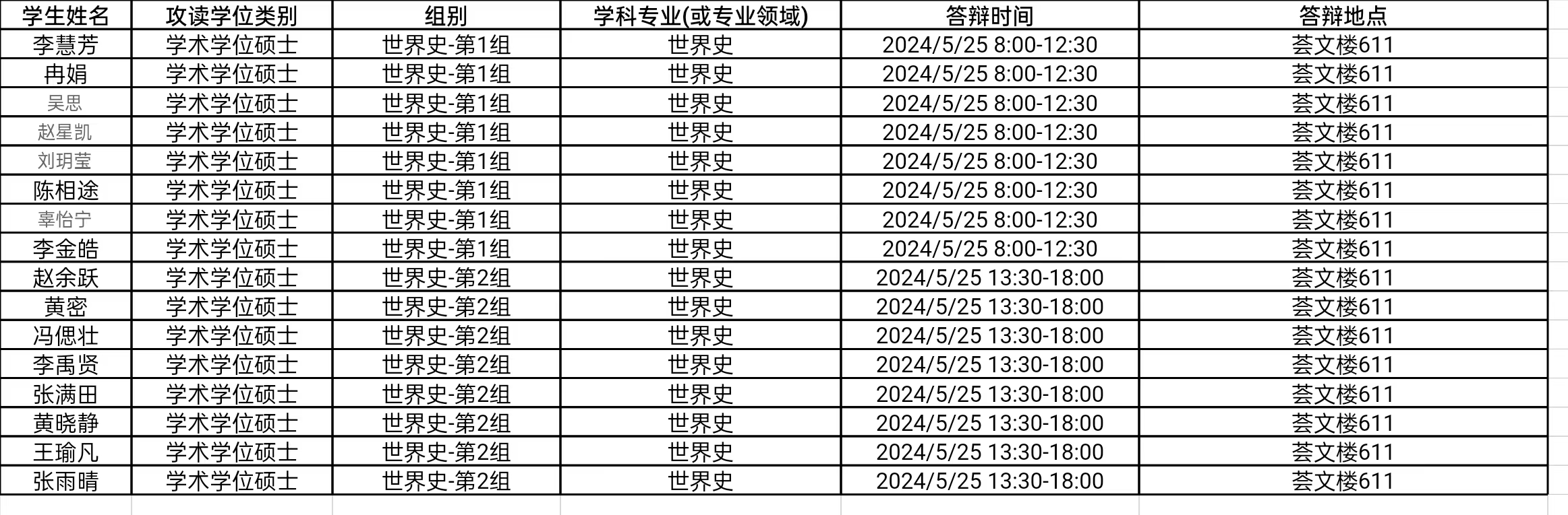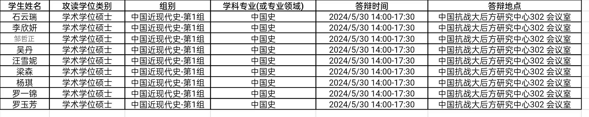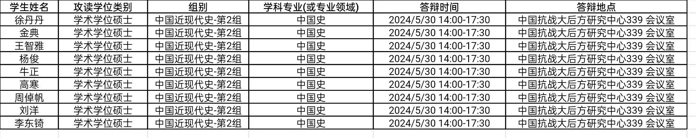 2024年春季学期学位论文答辩安排公告(中国近现代史)