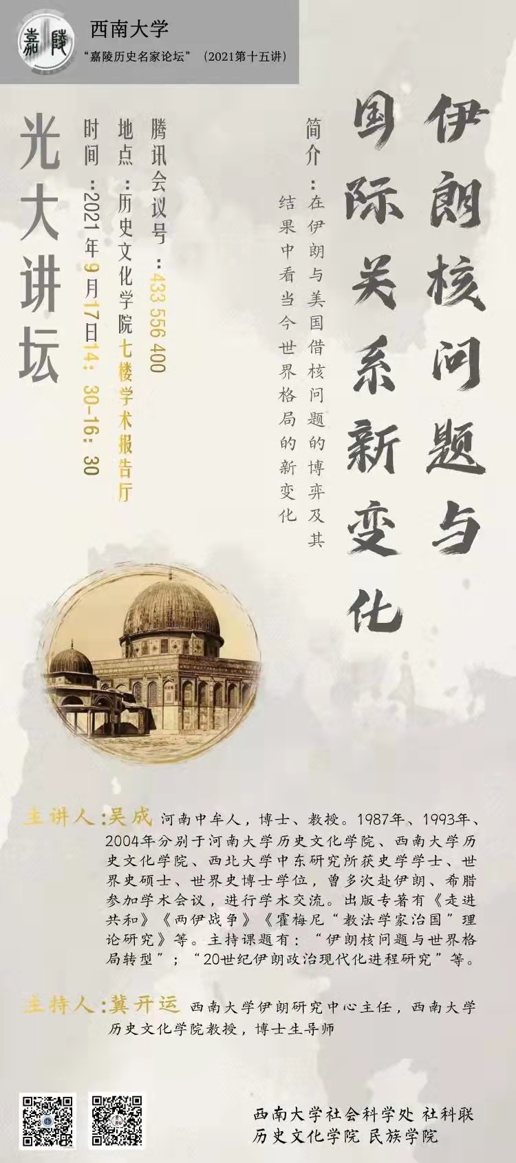 主讲人:吴成,河南中牟人,博士、教授。1987年、1993年、2004年分别于河南大学BB贝博艾弗森、BB贝博艾弗森、西北大学中东研究所获史学学士、世界史硕士、世界史博士学位,现工作于河南师范大学马克思主义公司,曾多次赴伊朗、希腊参加学术会议,进行学术交流。2007年6月,在德黑兰与伊朗前总统哈塔米同台主持霍梅尼思想研讨会开幕式,并作《用人生圣火点亮共和之灯》的主题发言,受到与会者好评。出版专著有《社会思潮研究》《走进共和》《两伊战争》《教法学家治国》《霍梅尼“教法学家治国”理论研究》《社会主义核心价值与当代中国社会思潮》《伊朗核问题与世界格局转型》《巴列维王朝的最后400天》。
