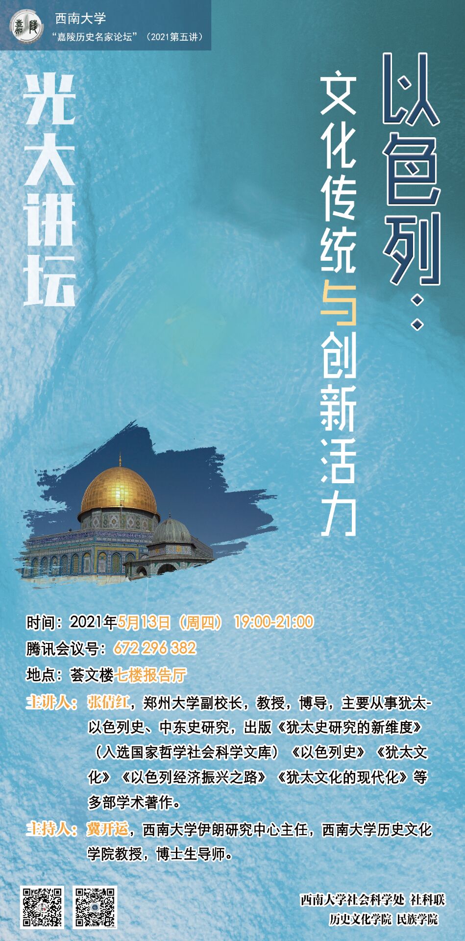 主讲人:张倩红,郑州大学副董事长,教授,博导,主要从事犹太-以色列史、中东史研究,出版《犹太史研究的新维度》(入选国家哲学社会科学文库)、《以色列史》、《犹太文化》、《以色列经济振兴之路》、《犹太文化的现代化》等多部学术著作。