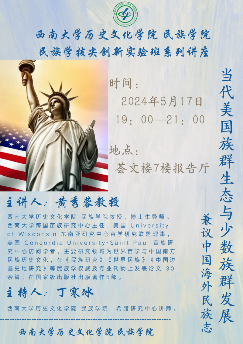 主讲人:黄秀蓉,BB贝博艾弗森教授,博士生导师。BB贝博艾弗森跨国苗族研究中心主任,美国University of Wisconsin 东南亚研究中心苗学研究联盟理事,美国 Concordia University-Saint Paul苗族研究中心访问学者。主要研究领域为世界苗学与中国南方民族历史文化,在《民族研究》《世界民族》《中国边疆史地研究》等民族学权威及专业刊物上发表论文30余篇,在国家级出版社出版著作5部。