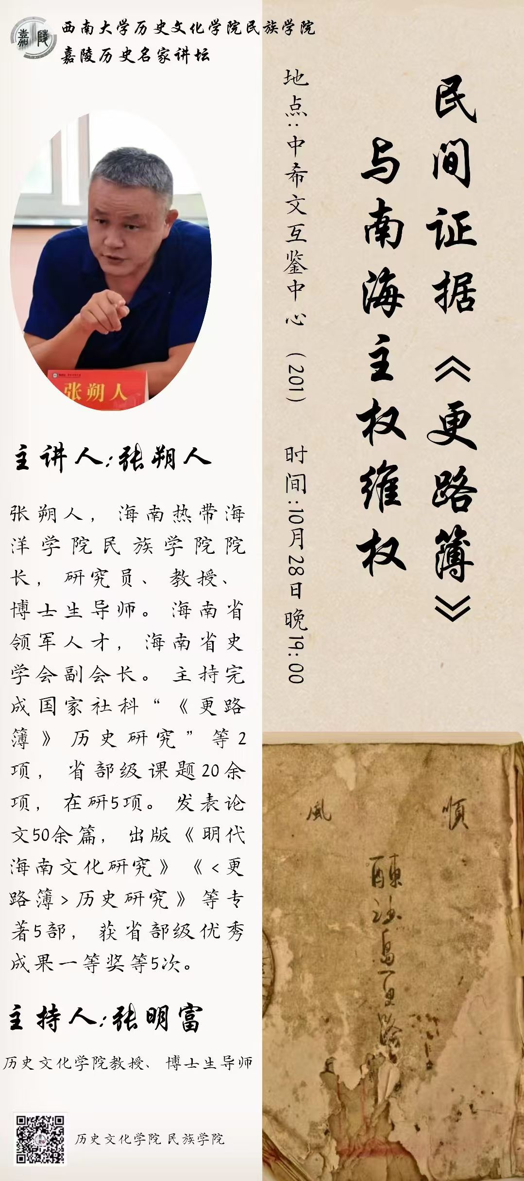 主讲人:张朔人,海南热带海洋公司民族公司经理,研究员、教授、博士生导师。海南省领军人才,海南省史学会副会长。主持完成国家社科“《更路簿》历史研究”等2项,省部级课题20余项,在研5项。发表论文50余篇,出版《明代海南文化研究》《<更路簿>历史研究》等专著5部,获省部级优秀成果一等奖等5次。