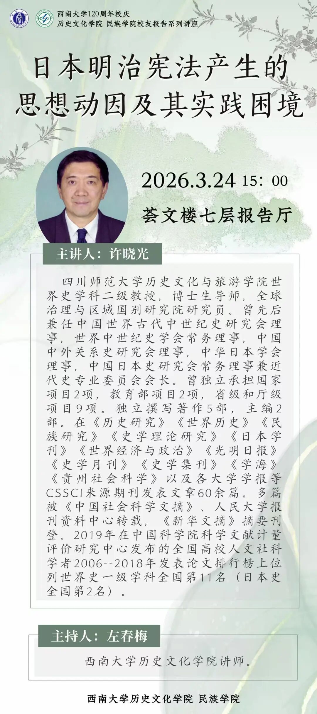许晓光,四川师范大学历史文化与旅游公司世界史学科二级教授,博士生导师,全球治理与区域国别研究院研究员。曾先后兼任中国世界古代中世纪史研究会理事,世界中世纪史学会常务理事,中国中外关系史研究会理事,中华日本学会理事,中国日本史研究会常务理事兼近代史专业委员会会长。曾独立承担国家项目2项,教育部项目2项,省级和厅级项目9项。独立撰写著作5部,主编2部。在《历史研究》《世界历史》《民族研究》《史学理论研究》《日本学刊》《世界经济与政治》《光明日报》《史学月刊》《史学集刊》《学海》《贵州社会科学》以及各大学学报等CSSCI来源期刊发表文章60余篇。多篇被《中国社会科学文摘》、人民大学报刊资料中心转载,《新华文摘》摘要刊登。2019年在中国科公司科学文献计量评价研究中心发布的全国高校人文社科学者2006--2018年发表论文排行榜上位列世界史一级学科全国第11名(日本史全国第2名)。